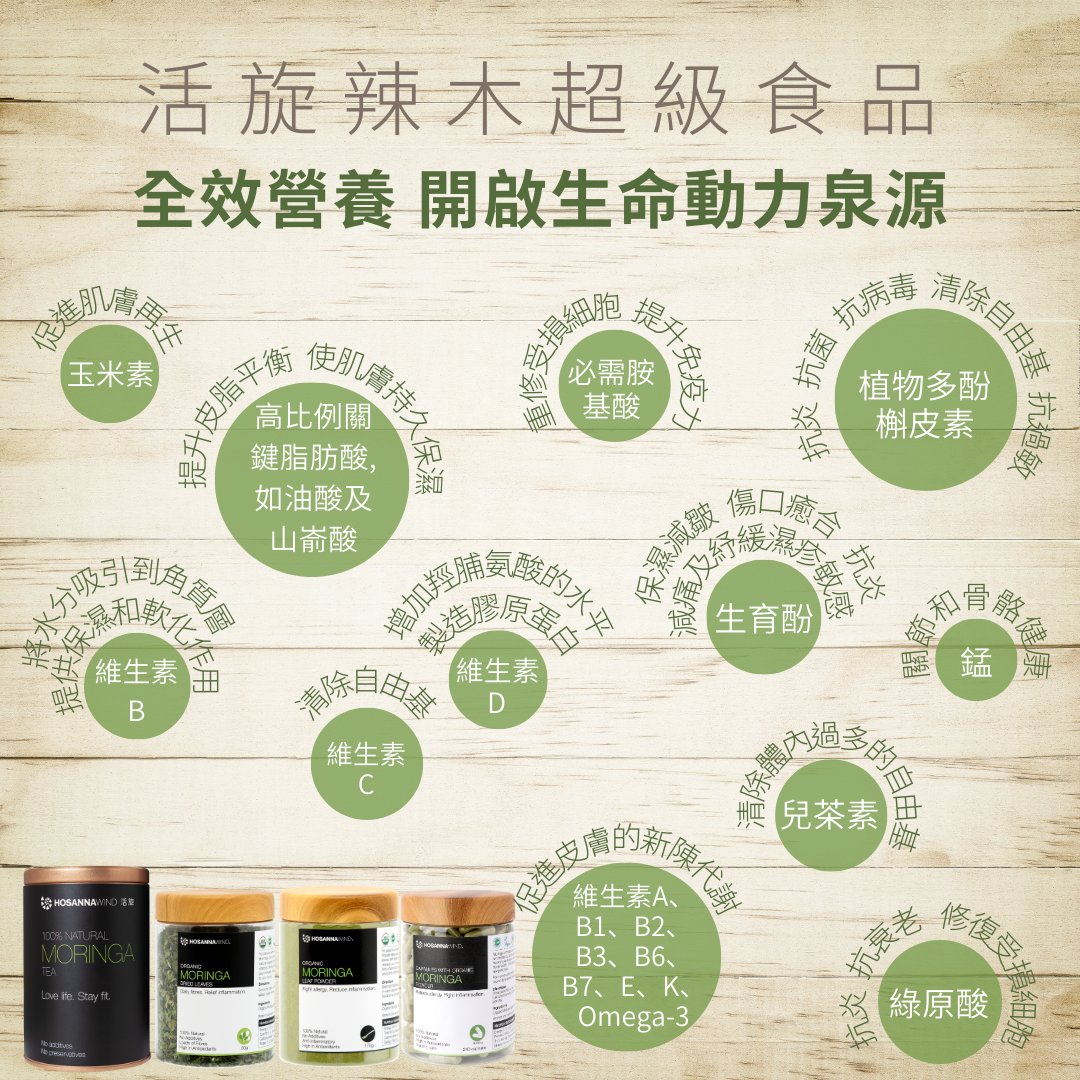 辣木又稱「生命樹」,含有豐富的蛋白質、維生素、46種抗氧化成分,如植物多酚槲皮素、綠原酸及辣木米辛,能夠抗衰老,修復受損細胞。又含36種抗炎營養素如生育酚、兒茶素及異硫氰酸脂等,能有效消炎,減輕筋膜及肌肉疼痛,預防皮膚及氣管敏感。辣木所含的18種氨基酸、多酚類及類黃酮等植物營養素,具有改善睡眠、增強免疫力及改善代謝等功效。