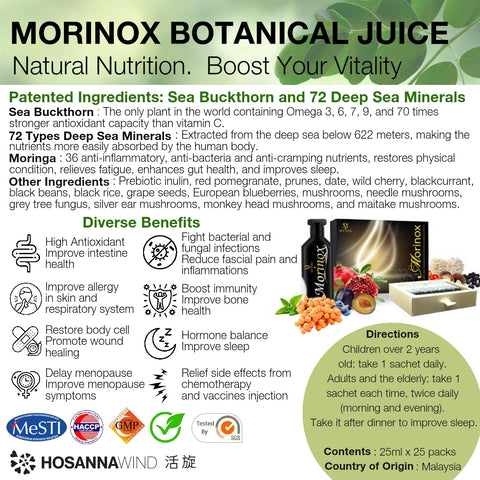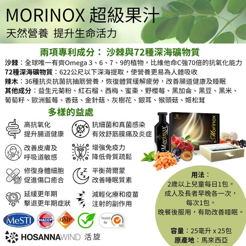MORINOX超級果汁,由多位博士團隊研發,採用高抗氧化抗炎天然成分,其中包含兩項專利成分:沙棘與72種深海礦物質。