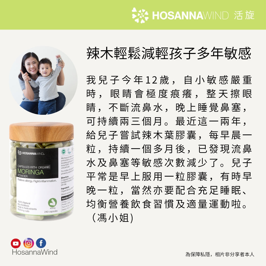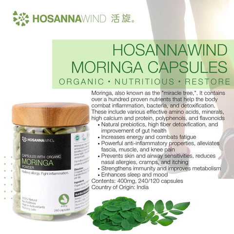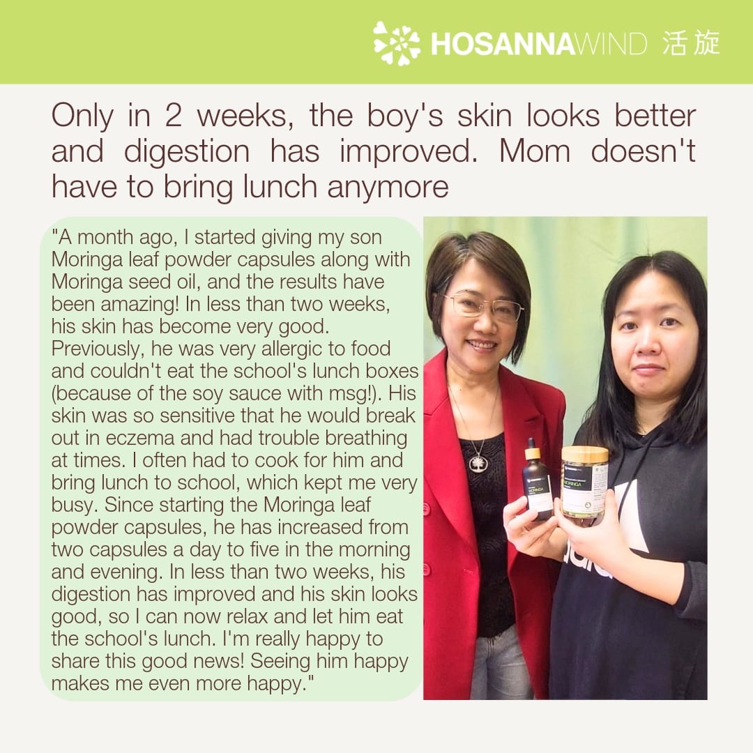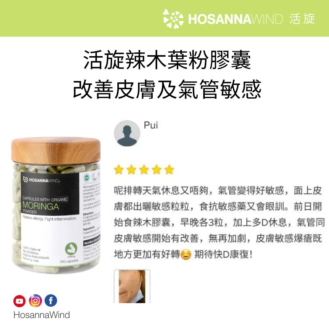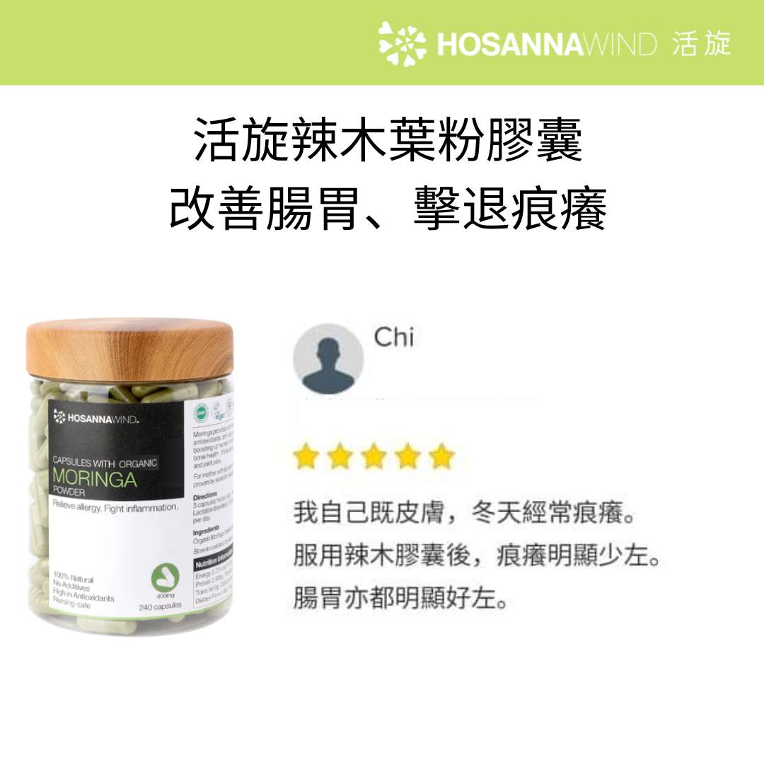 辣木葉是一種超級食物,能增強免疫力、幫助預防傷風感冒、迅速擊退疲勞及加強骨骼健康,高效抗氧化並可排毒美肌。它含有維生素A,C ,E,鈣,蛋白質,鐵,鎂 ,豐富膳食纖維和必需氨基酸。適合濕疹、皮膚過敏、痕癢、肌肉和關節疼痛,平日飲食不均衡,需要補充營養及膳食纖維的人。讓您保持健康的身體和健康的生活。