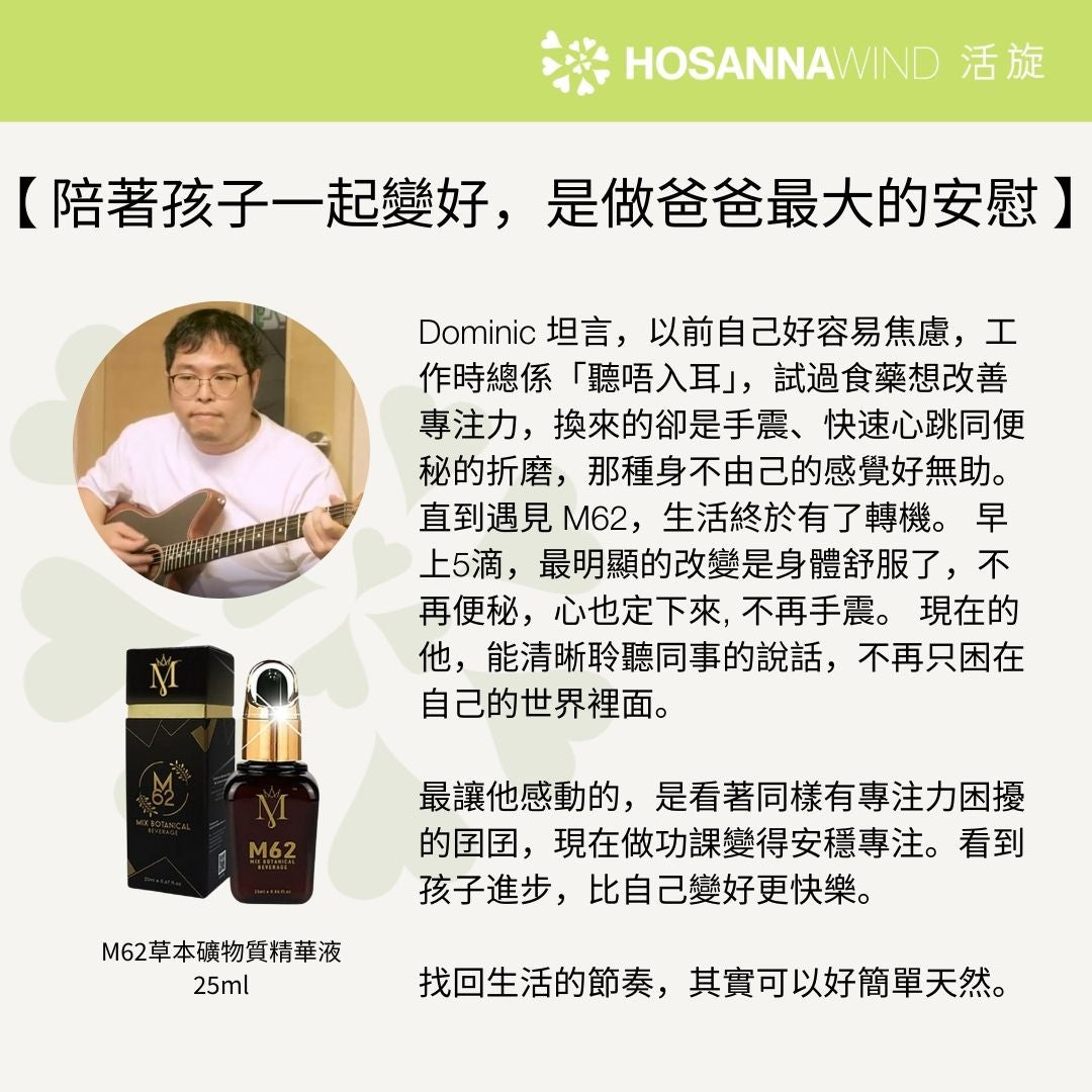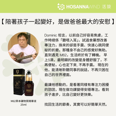 M62 草本礦物質精華液採用名貴中藥及優質天然草本植物提煉而成, 包括:辣木、靈芝、花旗參、人參、枸杞、蘆薈等,富含超過62種維持人體、大腦健康必需的微量礦物質,包括鈣、鎂、硒、鐵、鋅、鎂等重要元素。以高科技提煉,保留植物天然營養成分,100% 水溶性,讓人體充分吸收。