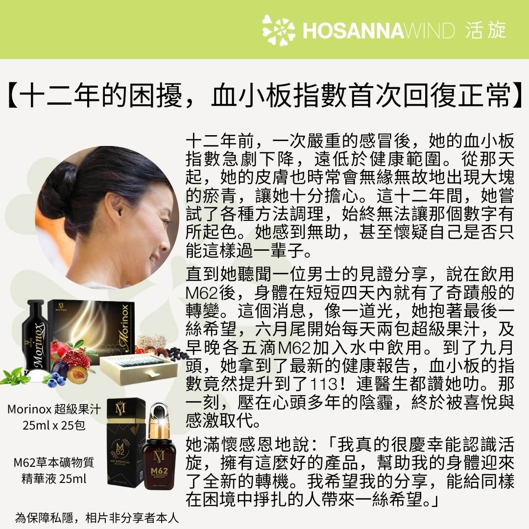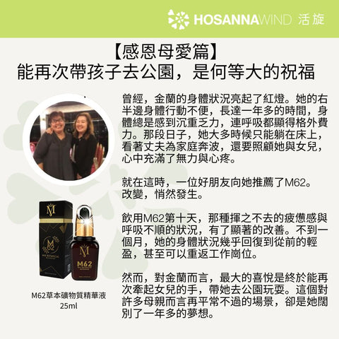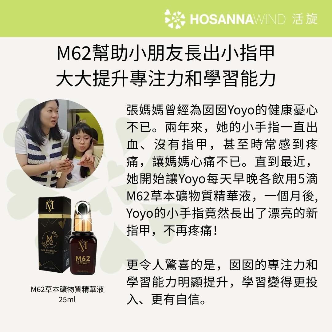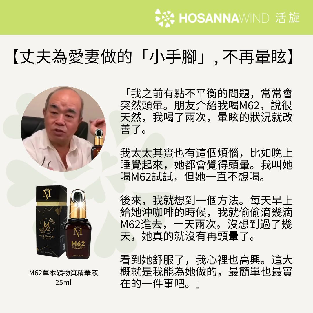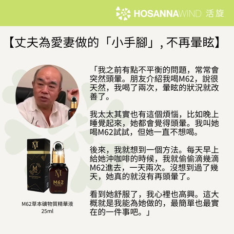 M62又名血管清道夫,幫助促進體內飽和脂肪酸的代謝,淨化血管的功效十分卓越,預防及改善中風後身體狀況及改善耳水不平衡等問題, 有十分正面的分享!