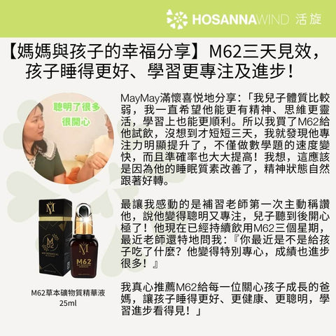M62能滋養神經遞質,增強腦神經及心血管機能。能提升專注力及記憶力、改善學習及工作能力。對於中風後或體弱症狀包括肌肉無力、關節問題、手腳麻痺、氣促氣喘、尤其明顯。